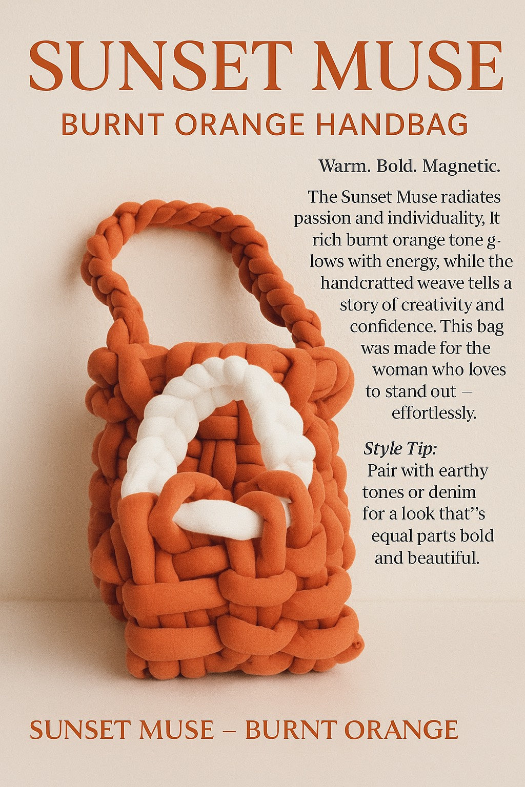 The Sunset Muse radiates passion and individuality. It's rich burnt orange tones goes with love and energy while the handcrafted weave tells a story of creativity and confidence. This bag was handmade for the women who loves to stand out.